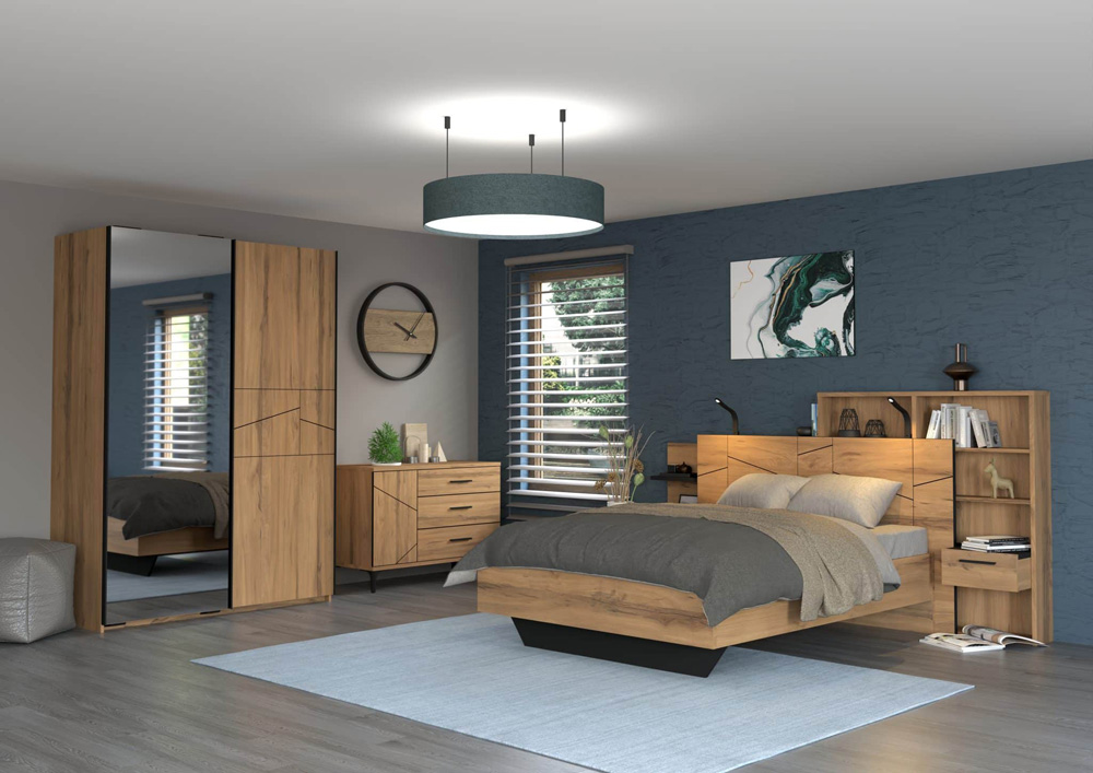Le lit au design structuré devient la pièce maîtresse de la pièce. Certaines configurations proposent des solutions de rangement discrètes. Les tables de chevet sont pratiques et harmonisées.