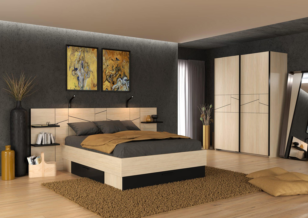 Le lit au design structuré devient la pièce maîtresse de la pièce. Certaines configurations proposent des solutions de rangement discrètes. Les tables de chevet sont pratiques et harmonisées.