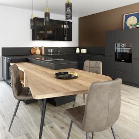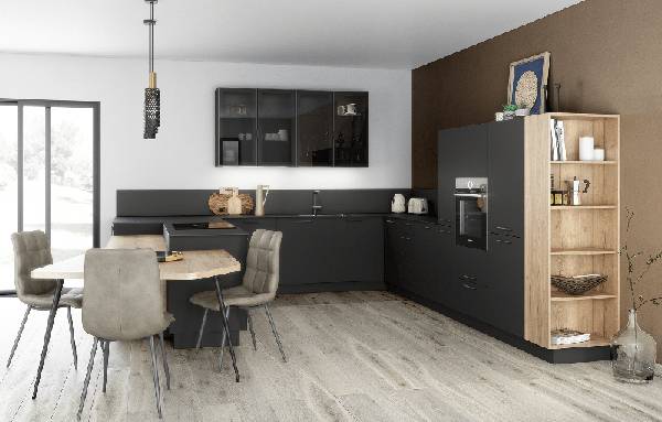 Un noir mat qui modernise et apporte du caractère, un chêne Halifax qui offre de l'authenticité à la cuisine. L'association des deux coloris est alors subtile et se veut résolument tendance ! La cuisine insuffle une tonalité forte en caractère.