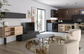 La décoration permet d'harmoniser l'ensemble des pièces de la maison et d'offrir une zone salon dans la continuité de la cuisine où le chêne et le noir se retrouvent et s'associent à merveille.