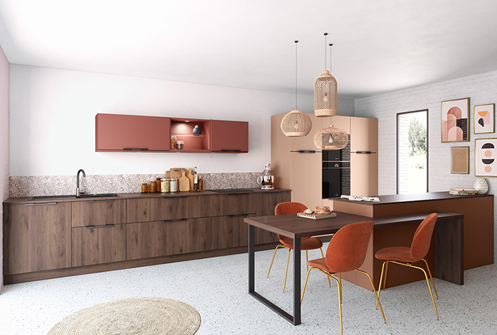La cuisine moderne OASIS & TOUNDRA et son camaïeu terracotta, lie de vin et nude sont en parfaite adéquation avec les couleurs du moment et nous transportent vers une ambiance bohème, pour les fans de déco qui ne font rien comme tout le monde !