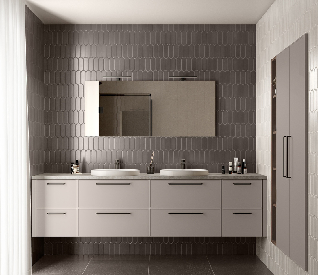 Le modèle Alizé Tourterelle s’associe à un plan de toilette en stratifié structuré décor Neptune, parfaitement assorti en ton sur ton, complété par des vasques ovales semi encastrées. Un ensemble qui allie modernité, cohérence esthétique et grande capacité de rangement.